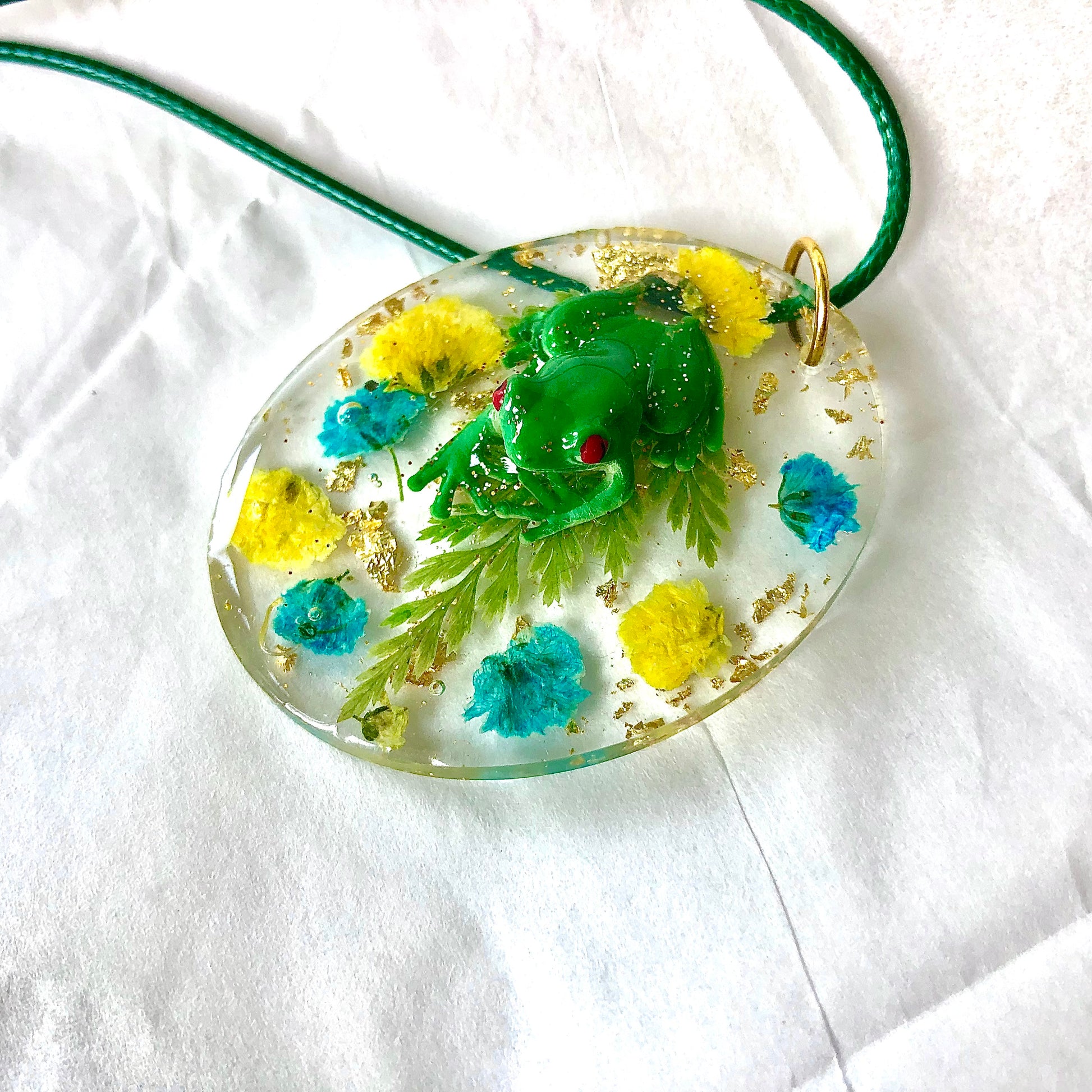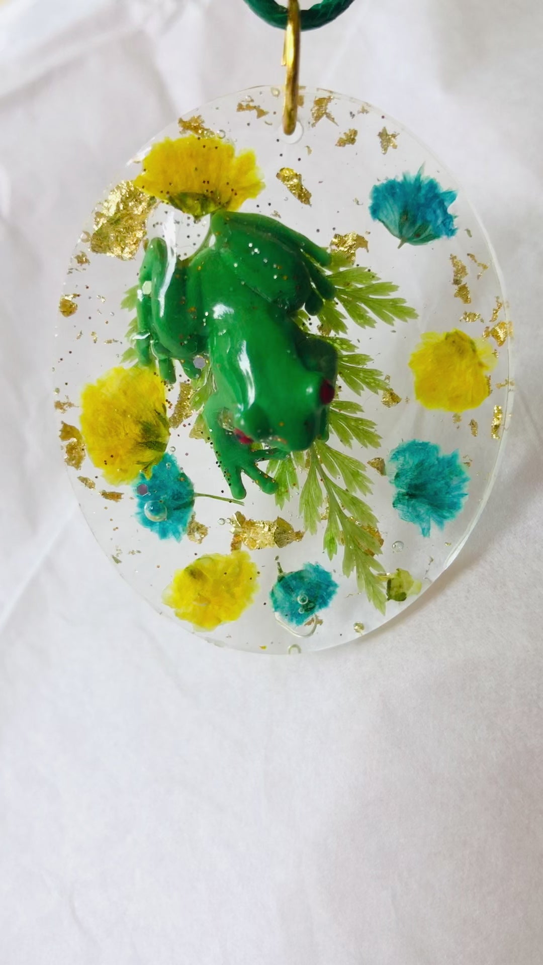 Little frog hanging out on a leaf surrounded by beautiful blue and yellow flowers.